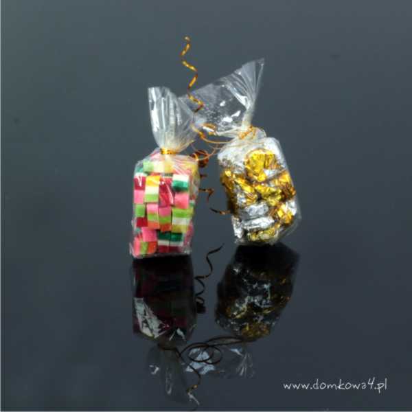 Dwie miniaturowe paczki cukierków w opakowaniu z celofanu, przewiązane złotą wstążką.