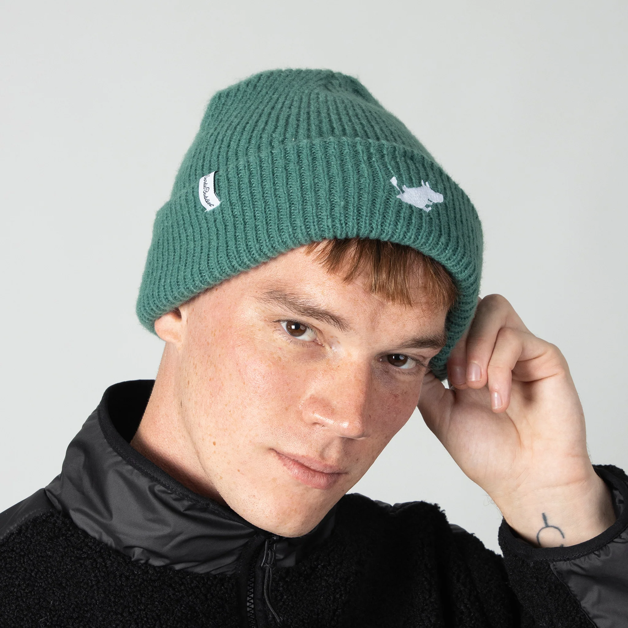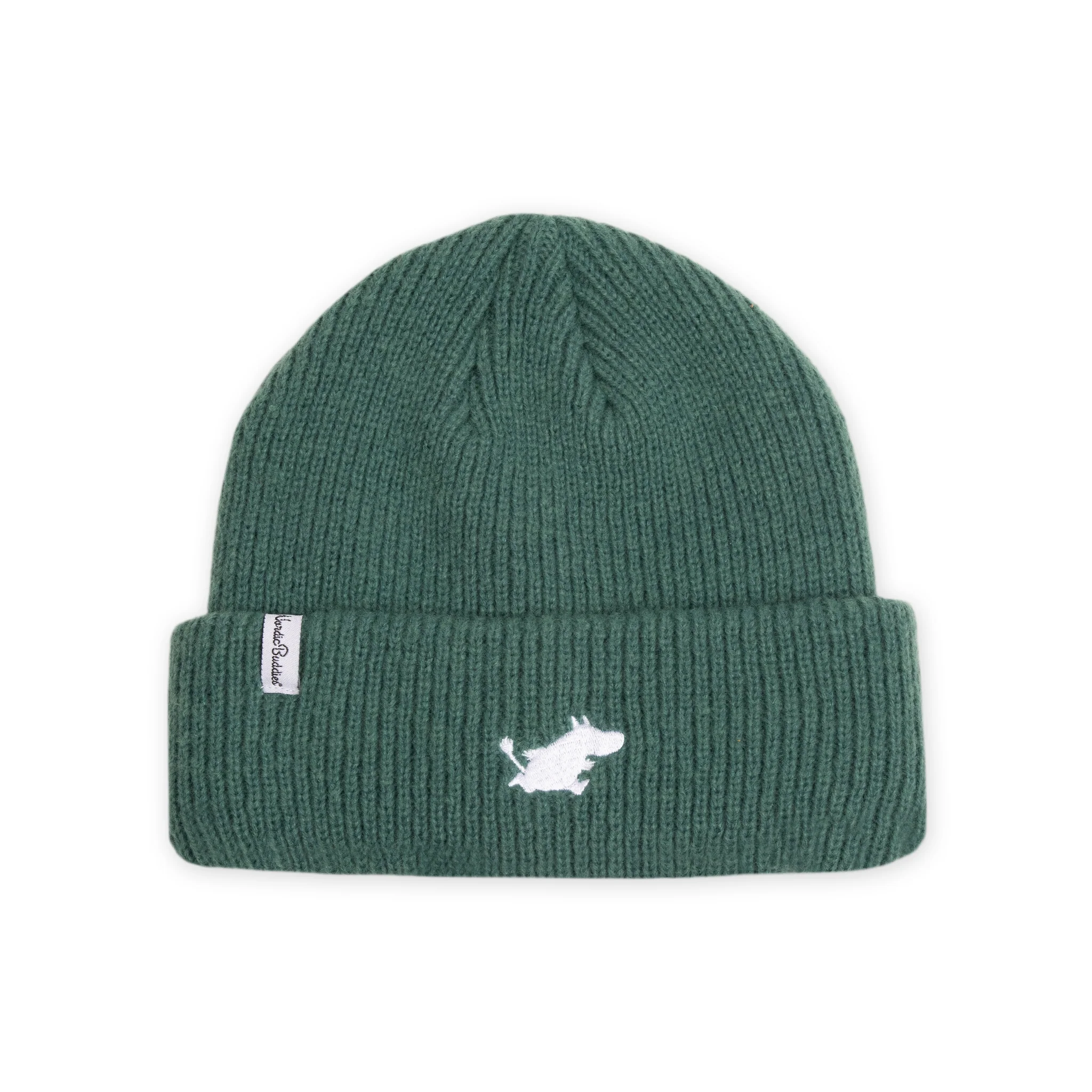Czapka jest w kolorze zielonym, a na przedniej części wyhaftowana jest na biało postać Muminka.
