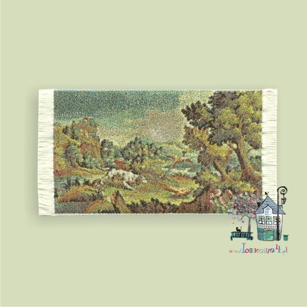 Drobno utkany gobelin z pejzażem z psem i ptakami.