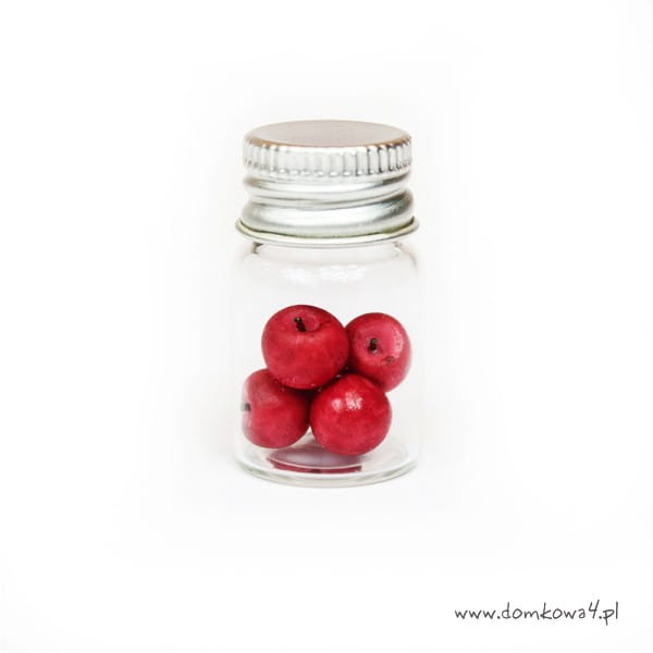 Starannie wykonana miniatura jabłek w czterech kolorach zamkniętych w słoiku. Jabłka wykonane są z utwardzonej masy plastycznej czerwonej, zielonej, pomarańczowej i żółtej. Słoik jest zakręcany metalową nakrętką, którą można odkręcić.