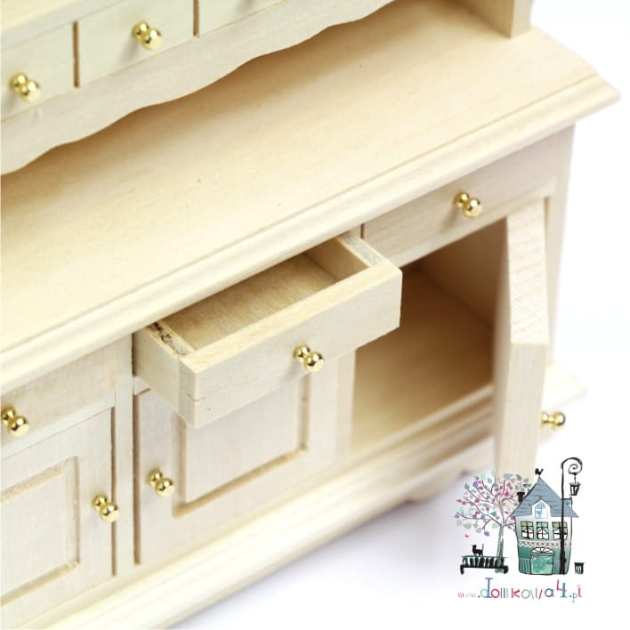 Miniaturkowy kredens kuchenny wykonany z jasnego, surowego drewna. Mebelek posiada w dolnej części trzy wysuwane szufladki i trzy otwierane szafki. W górnej części pod jedną z półek znajduje się jedna długa wysuwana szuflada.