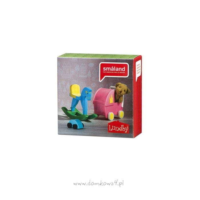 Zestaw zabawek dla dzieci z domków dla lalek "Lundby". W skład zestawu wchodzi konik na biegunach, wózek dla lalki, drewniany samochodzik i miś pluszowy.