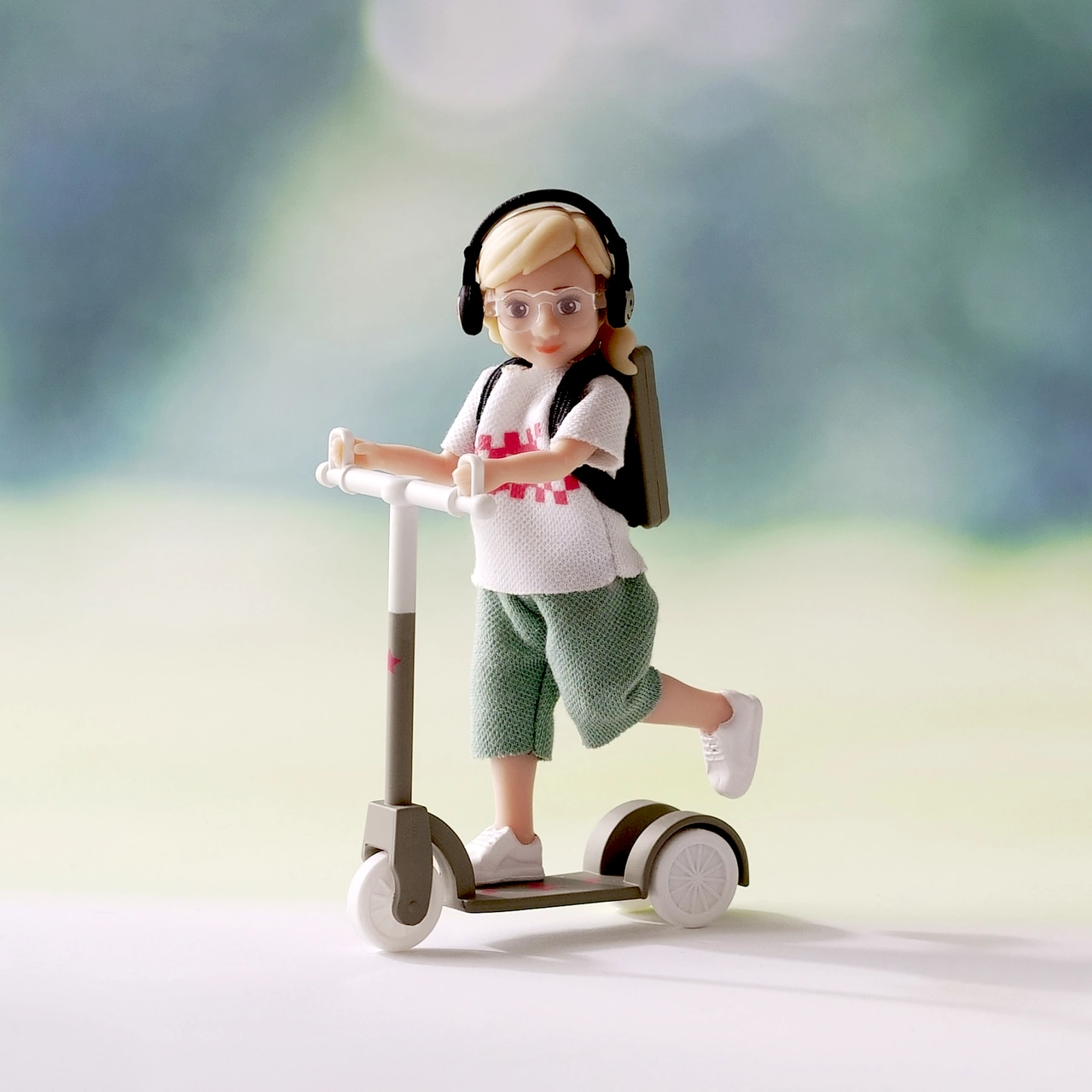 Lalka dziewczynka z hulajnogą do domku dla lalek "Lundby". Lalka ma zginane nogi i ręce oraz obracaną głowę. Strój lalki jest współczesny i uszyty z naturalnych materiałów. Ubrania można zdejmować. Koła przy hulajnodze kręcą się.