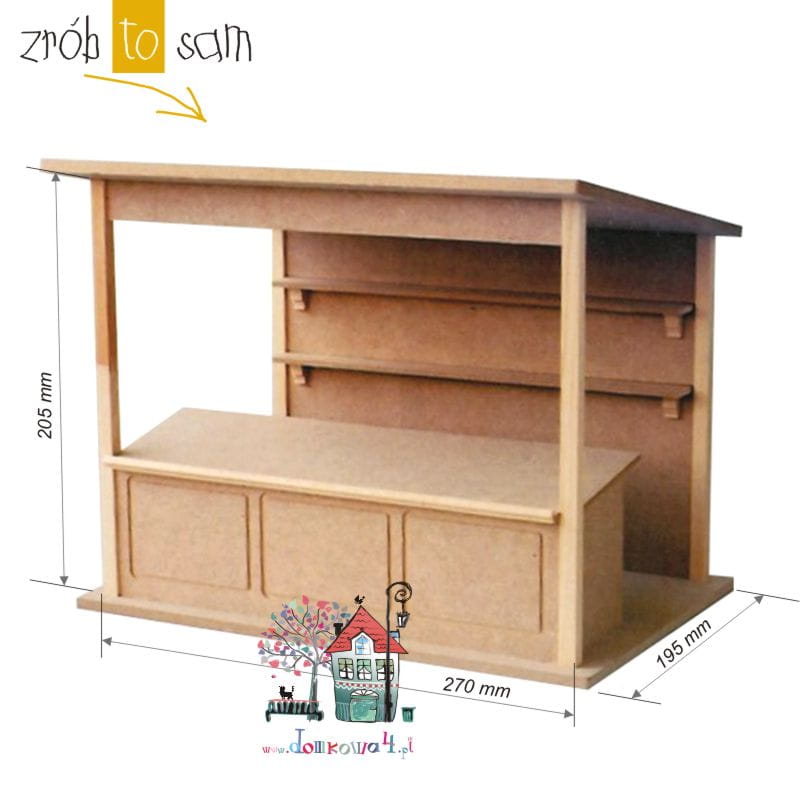 Zestaw do własnego montażu. W zestawie znajdziecie komplet wyciętych elementów drewnianych i z płyty MDF potrzebnych do budowy straganu.