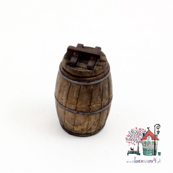 Miniaturowa imitacja drewnianej beczki. Beczka jest wykonana z drewna a obręcze z metalu. Wieko beczki nie jest otwierane.