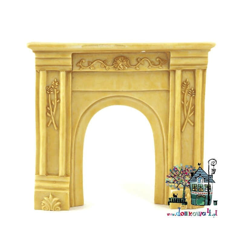 Fasada kominkowa w kolorze beżowym. Fasada posiada bardzo ładne, delikatne zdobienia motywami roślinnymi. Odlew od tyłu jest płaski aby łatwiej można było przymocować fasadę do ściany w domku dla lalek.