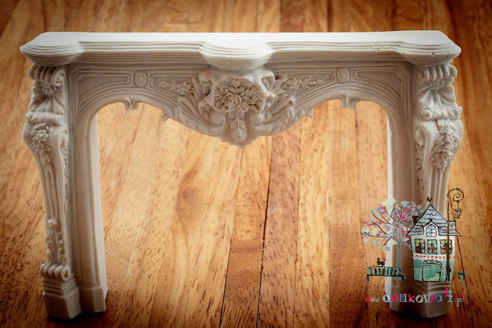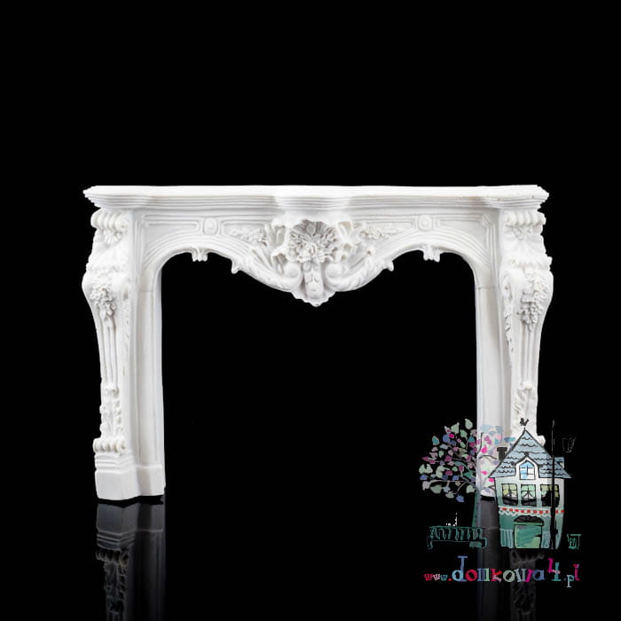 Bogata w zdobienia fasada kominkowa w kolorze białym. Odlew od tyłu jest płaski aby łatwiej można było przymocować fasadę do ściany w domku dla lalek.