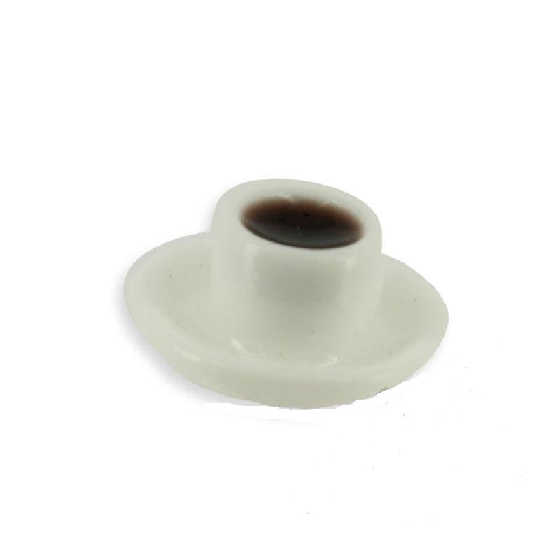 Miniaturowa filiżanka z kawą espresso. Filiżanka przyklejona jest stale do talerzyka.