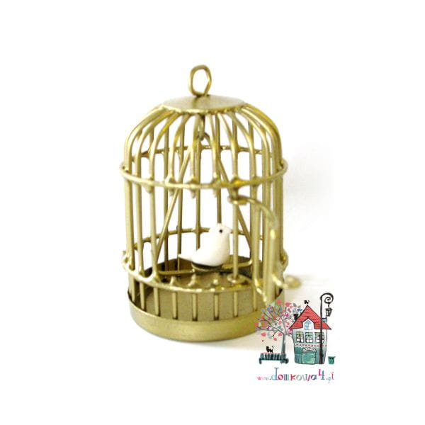 Miniaturowa złota klatka z białym kanarkiem. Klatka wykonana jest z metalu i ma przesuwane od góry drzwiczki.