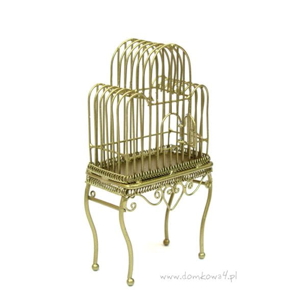 Miniaturowa klatka dla ptaków - stojąca, wykonana z metalu i polakierowana na kolor złoty. Klatka posiada otwierane drzwiczki.