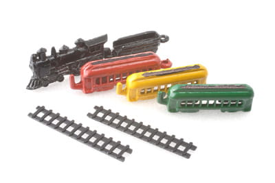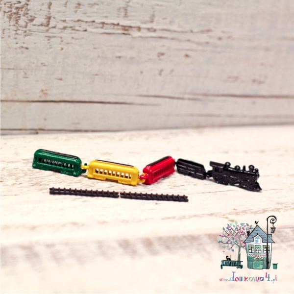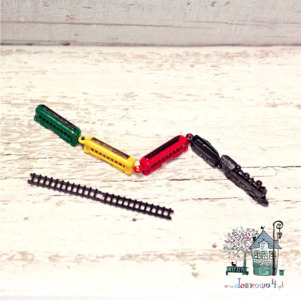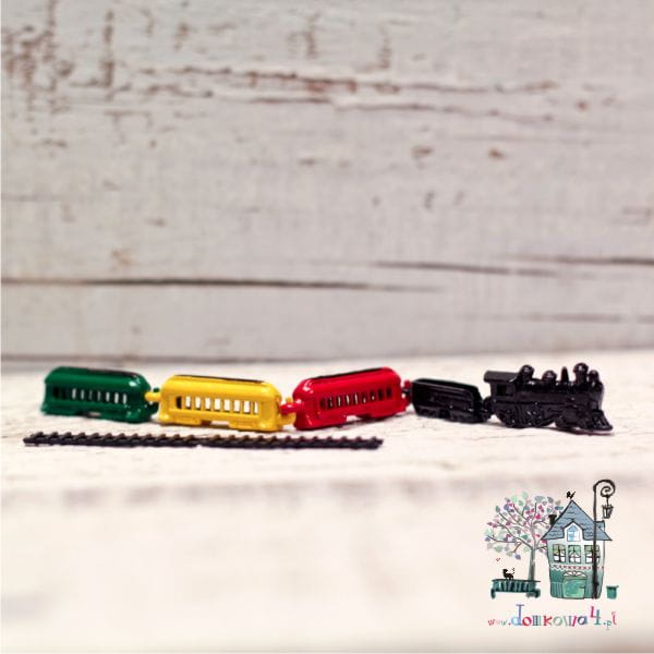 Mini zabawka do domku dla lalek - kolejka metalowa z lokomotywą, trzema wagonami i fragmentem torów.
