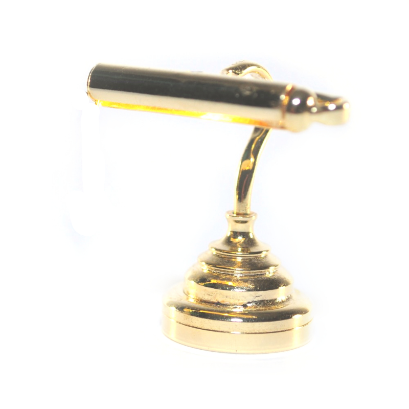 Miniaturowa lampa LED przystosowana do oświetlenia obrazu w domku dla lalek. Korpus lampki bardzo starannie złocony.