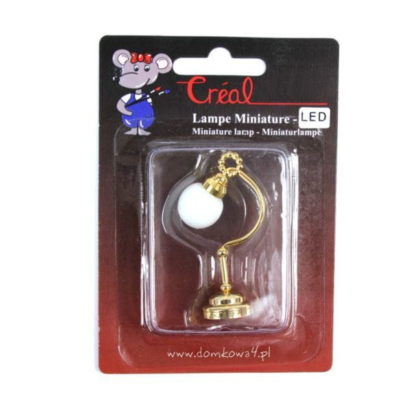 Miniaturowa lampa stołowa z korpusem w kolorze błyszczącego złota i białym, kulistym kloszem. Górna część lampy ozdobiona okrągłym elementem również w kolorze złotym. Przy podstawie, w dolnej części, lampa posiada mini wyłącznik.