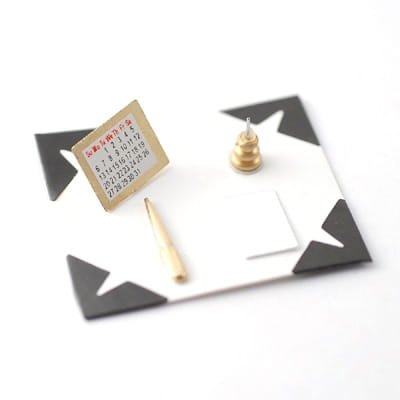 Miniaturowy komplet na biurko. Zestaw zawiera podkładkę, do której przymocowane są nożyk do listów, notes, kałamarz oraz stojący kalendarz. Taki element świetnie ozdobi np. gabinet w domku dla lalek.