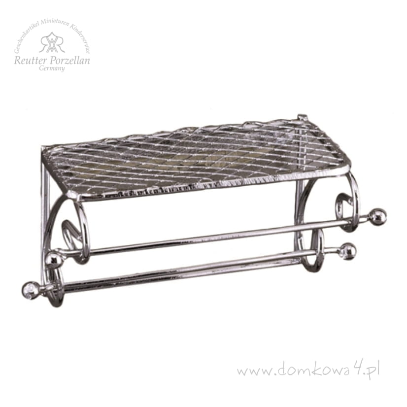 Miniaturowa, metalowa półka do powieszenia na ścianie w łazience domku dla lalek. Półka wykonana ze srebrnego metalu, z kratkowaną nadstawką u góry i zdobionymi kątownikami.