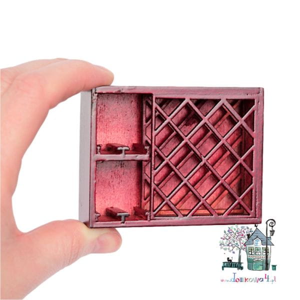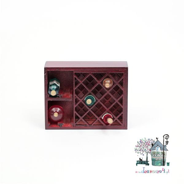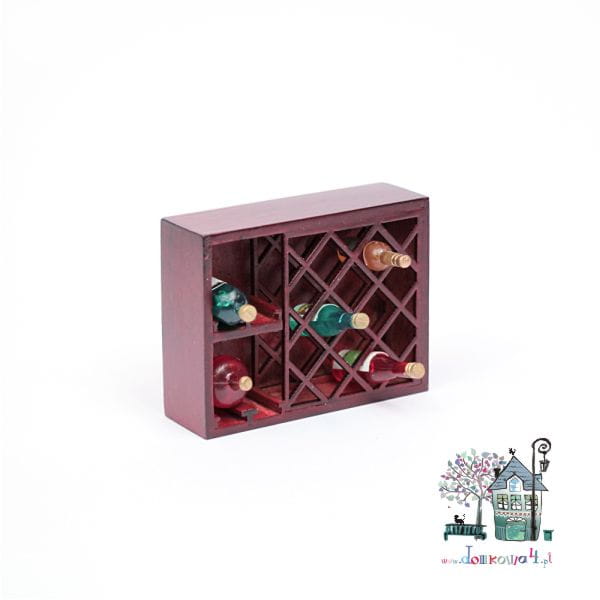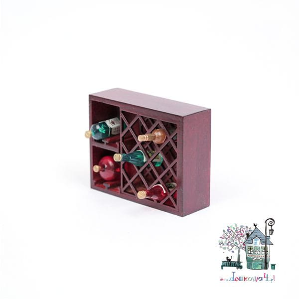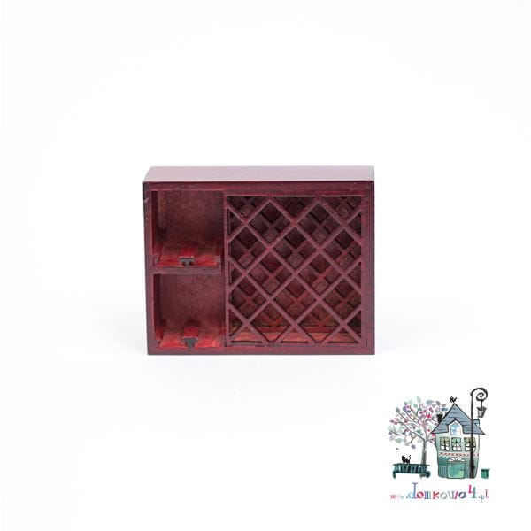 Miniaturowa, drewniana półka z przegrodami do przechowywania wina. Całość wykonana z drewna i polakierowana na mahoniowy kolor.