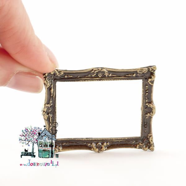 Prostokątna, metalowa rama w kolorze patynowanego złota, bardzo ozdobna i delikatna.