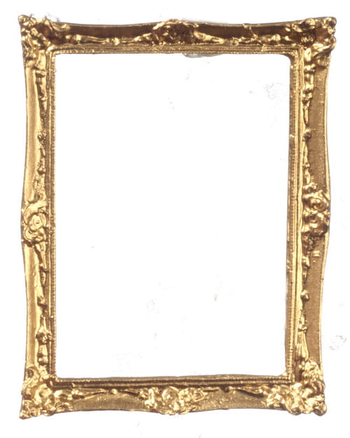 Miniaturowa prostokątna, metalowa rama w kolorze błyszczącego złota, bardzo ozdobna i delikatna.