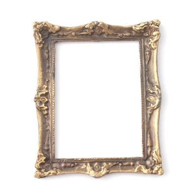 Miniaturowa prostokątna, metalowa rama w kolorze patynowanego złota, bardzo ozdobna i delikatna.