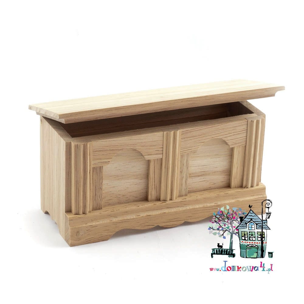 Starannie wykonana miniaturowa skrzynia drewniana z otwieraną górną częścią. Miniatura wykonana jest z litego, liściastego drewna.