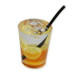 Miniaturowa szklanka przeźroczysta z pomarańczowym drinkiem. Do szklanki dołączona jest słomka oraz plasterki cytryny.