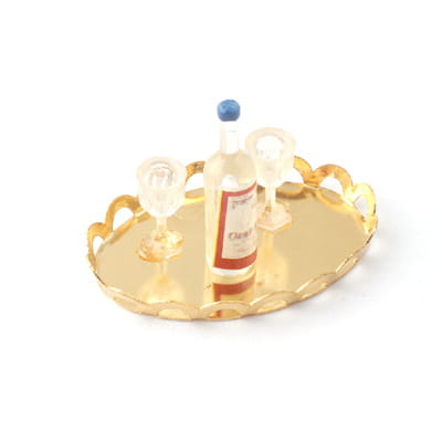 Czteroelementowy zestaw miniaturowy w skład którego wchodzą: złota taca, dwa kieliszki oraz butelka z alkoholem. Całość wykonana starannie.