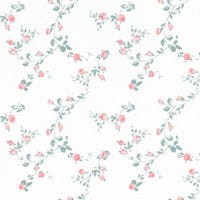 Tapeta "Sissinghurst White". Papierowa tapeta z białym tłem ozdobionym drobnymi różyczkami. Detale w kolorach brzoskwini i zieleni. Idealnie sprawdzi się w salonie lub jadalni w domku dla lalek.