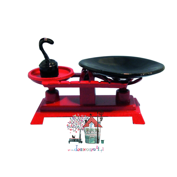 Waga kuchenna czerwono-czarna, ruchoma, wykonana w całości z metalu .
