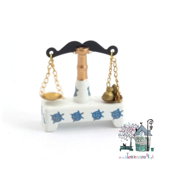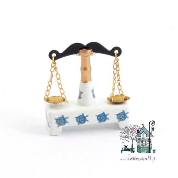 Waga z dwiema wiszącymi szalkami. Korpus wagi wykonany z drewna imituje korpus porcelanowy. W komplecie dwa miniaturowe odważniki.