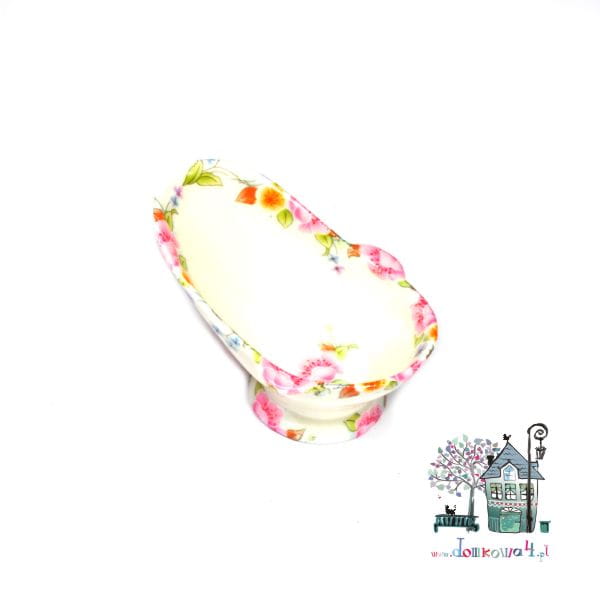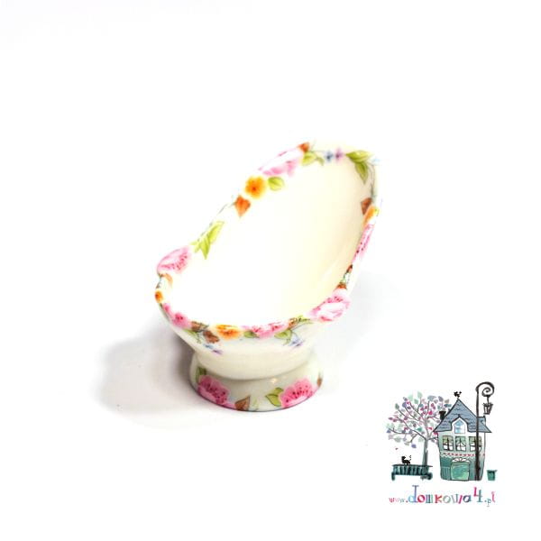 Miniaturowa wanienka dla niemowlaka wykonana z porcelany. Wanienka jest odpowiednio wyprofilowana i ozdobiona delikatnymi motywami kwiatowymi.