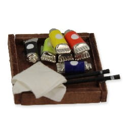 Komplet miniaturowych farb w tubach do malowania obrazów. W zestawie z farbami znajdują się także 2 pędzle oraz ściereczka. Całość stale przymocowana do drewnianej kasetki. Miniaturka doskonale uzupełni wyposażenie domku dla lalek
