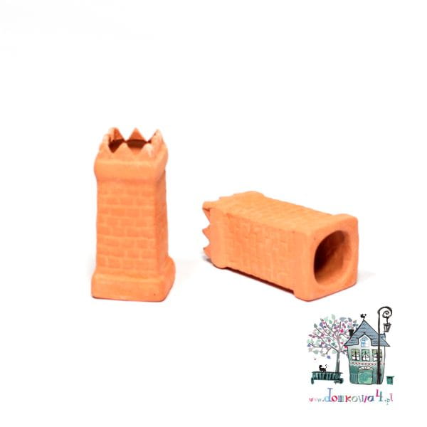 2 miniaturowe kominy w ceglastym kolorze. Kominy są wykonane z glinki ceramicznej i doskonale imitują prawdziwe kominy murowane z cegły. Wewnątrz jest pusta przestrzeń.