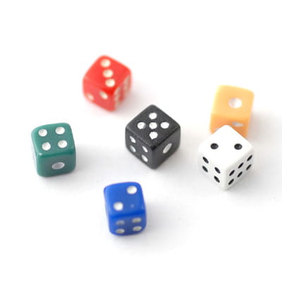 Miniaturowe, kolorowe kości do gry. W komplecie znajduje się 6 różnokolorowych kości. Idealne do ozdoby pokoju dziecka w domku dla lalek.