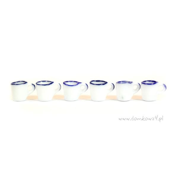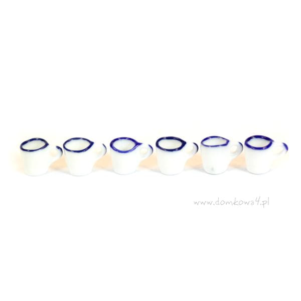 Porcelanowy komplet sześciu miniaturowych kubków do mleka w kolorze białym z niebieską lamówką u góry.