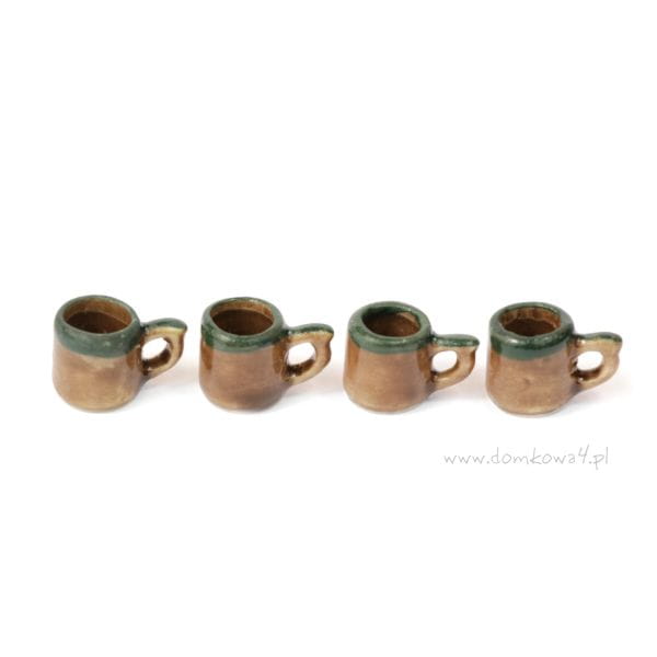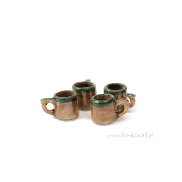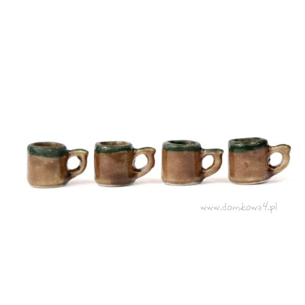 Porcelanowy komplet czterech miniaturowych kubków w kolorze brązowym z zieloną lamówką u góry.