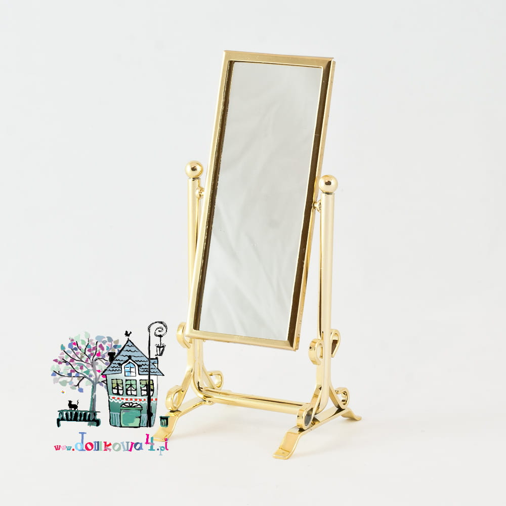 Lustro stojące obrotowe, osadzone na metalowej konstrukcji i w metalowej złotej ramie. Wstawiona tafla lustrzana jest prawdziwym lustrem.