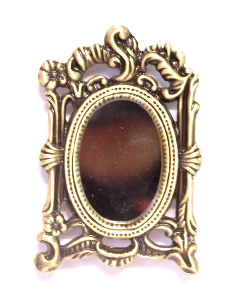 Miniaturowe lustro w metalowej ramie do powieszenia na ścianę. Rama bardzo ozdobna, w kolorze patynowanego złota.
