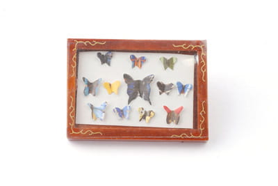 Miniaturowa kolekcja motyli w ozdobnej ramie.