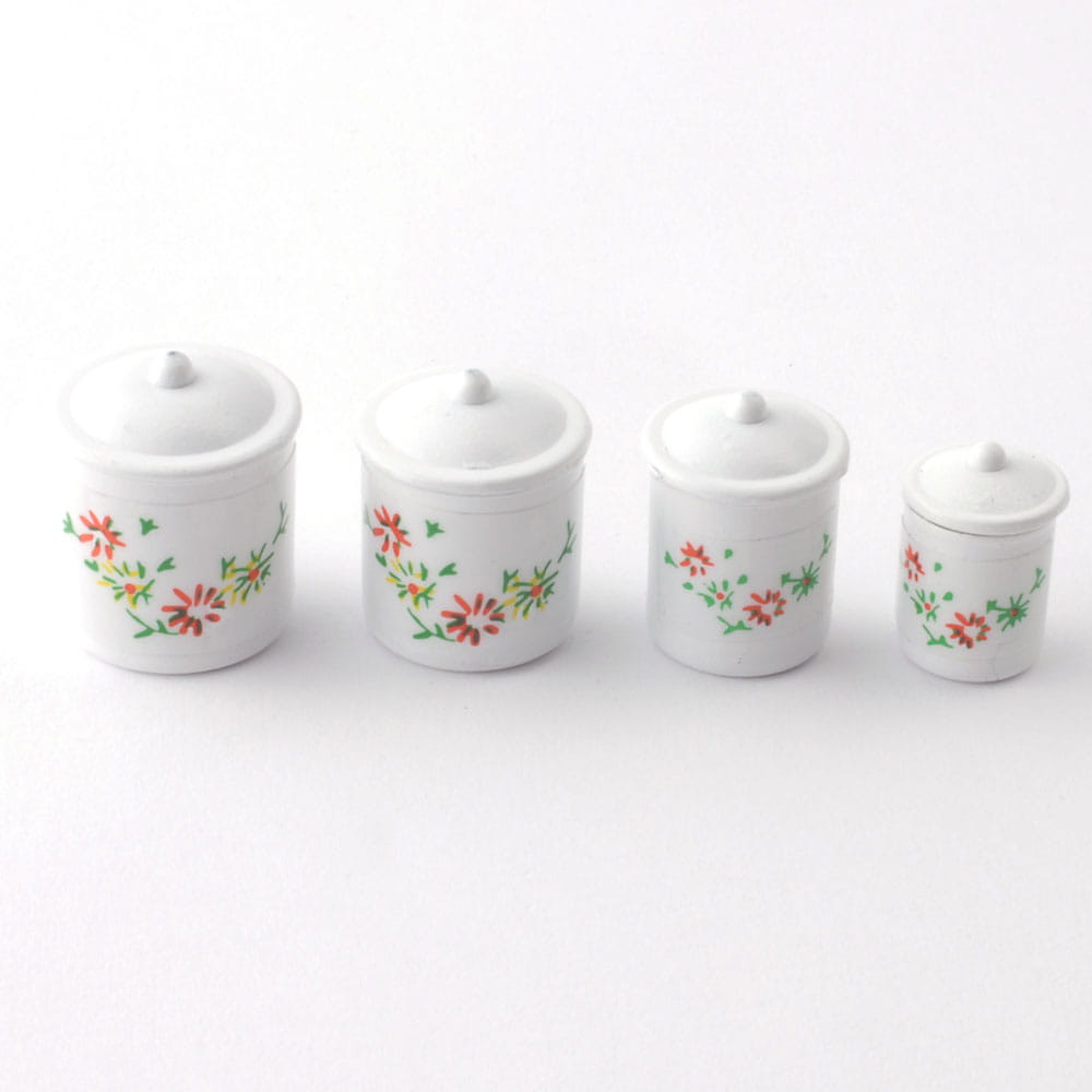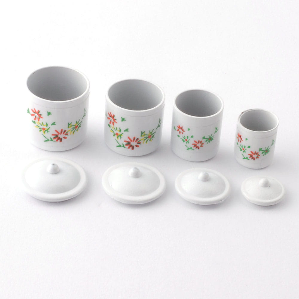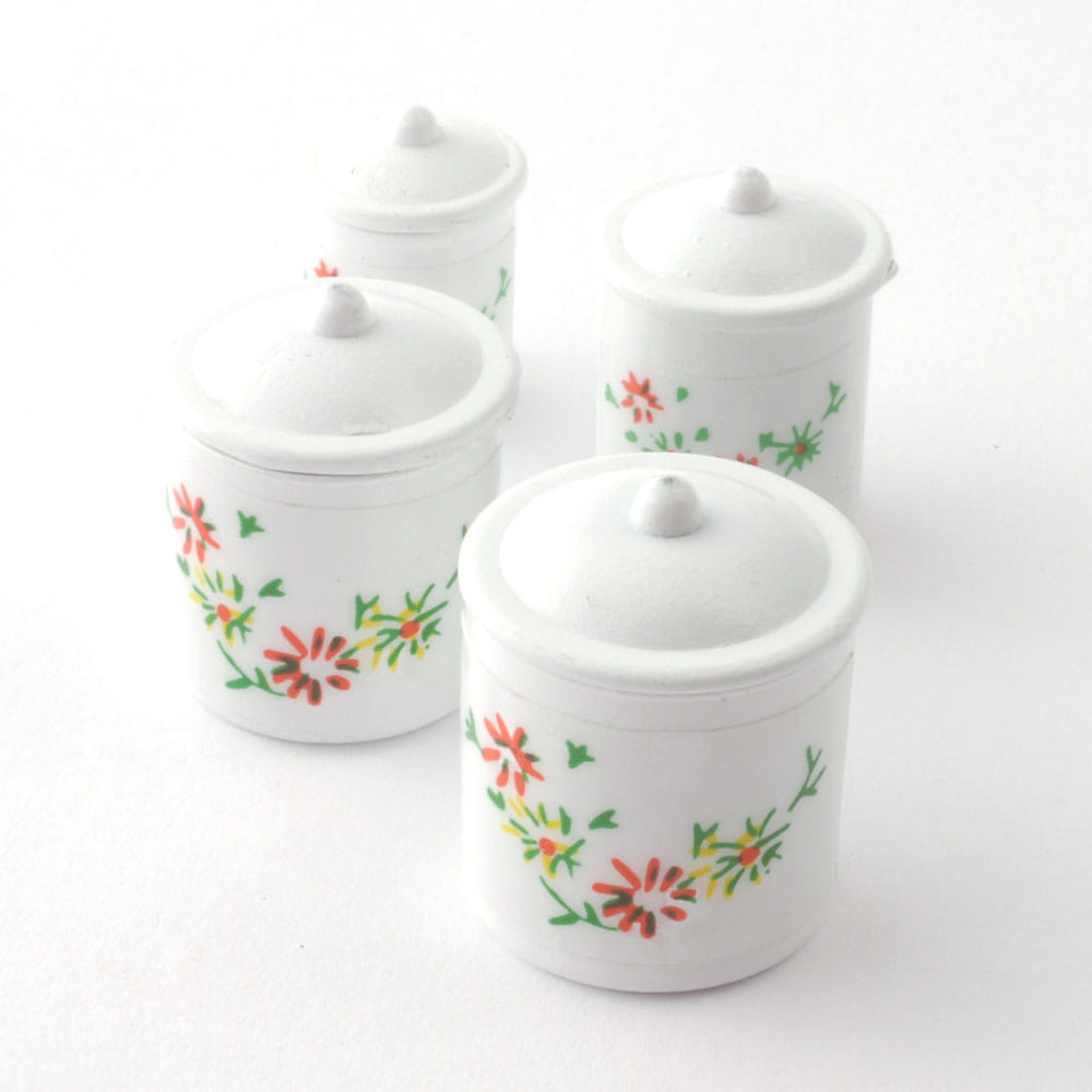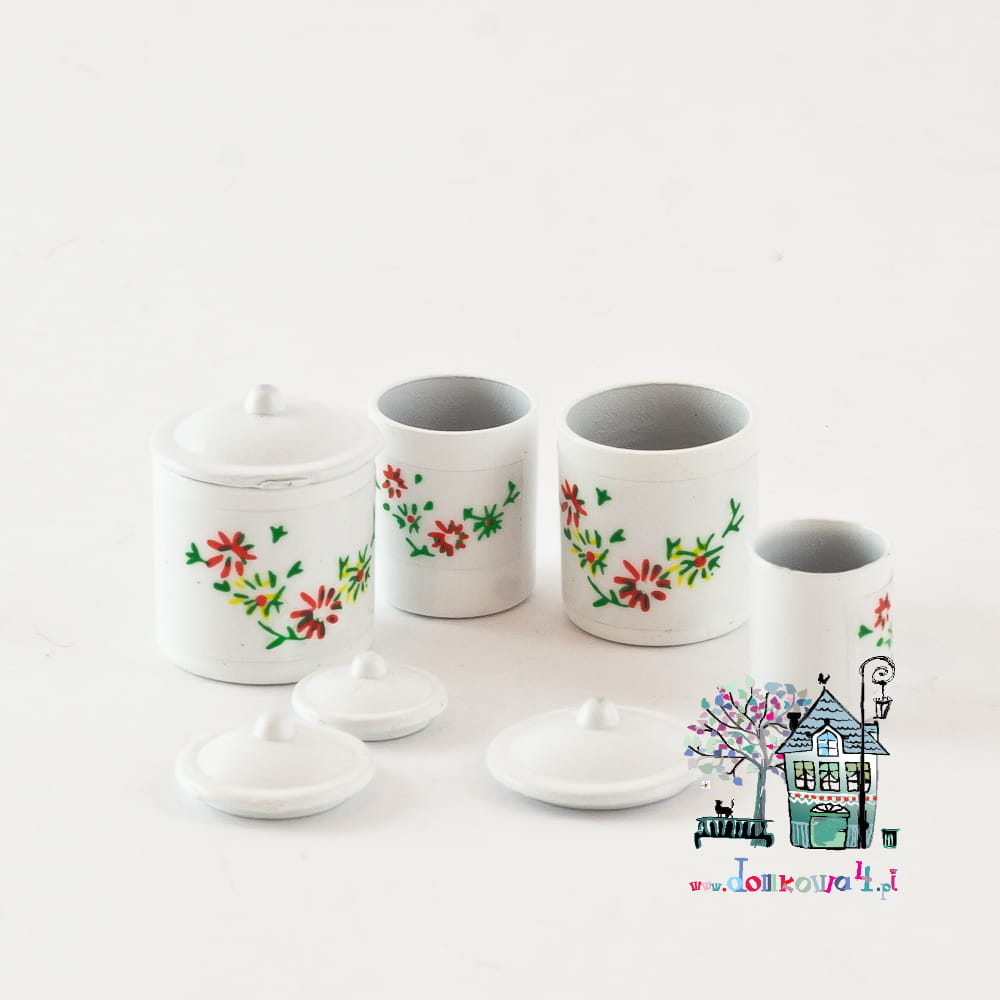 Komplet czterech metalowych pojemników z pokrywkami. Pojemniki są o różnych średnicach co pozwala na chowanie jednego pojemnika w drugi. Całość przyozdobiona kalkomanią w kwiatki.