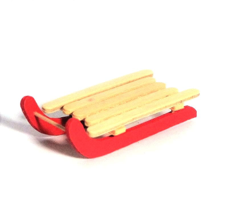 Miniaturowe klasyczne sanki drewniane wykonane z jasnego drewna z czerwonymi płozami.