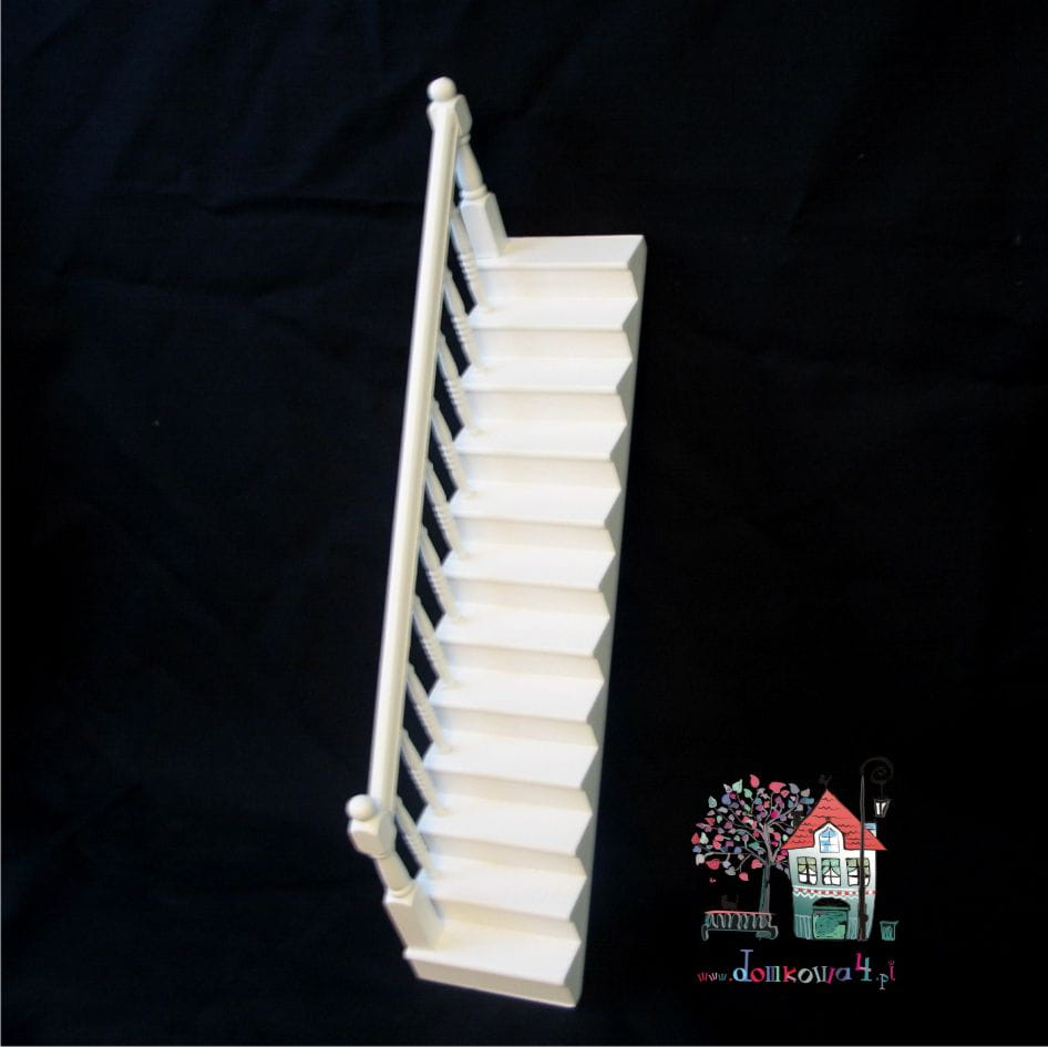 Drewniane schody do domku dla lalek, pomalowane na kolor biały. W komplecie przymocowana widoczna poręcz z tralkami.