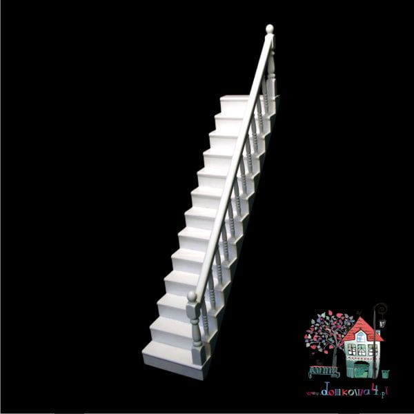 Drewniane schody do domku dla lalek, pomalowane na kolor biały. W komplecie przymocowana widoczna poręcz z tralkami.