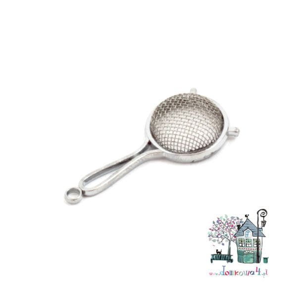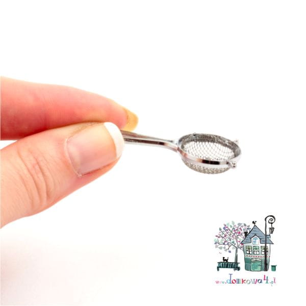 Metalowe, miniaturowe sitko kuchenne w kolorze błyszcząco-srebrnym.