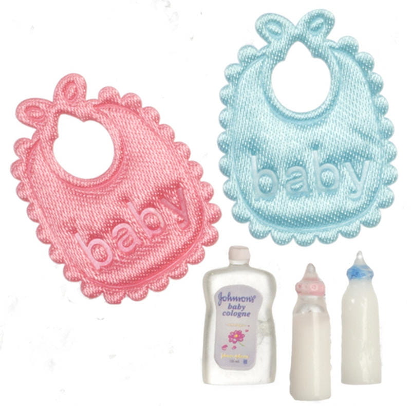 Miniatura dwóch śliniaków, dwóch butelek i butelki z dziecięcą oliwką. Śliniaki wykonane są z jaskrawego materiału i posiadają wytłoczone napisy BABY.