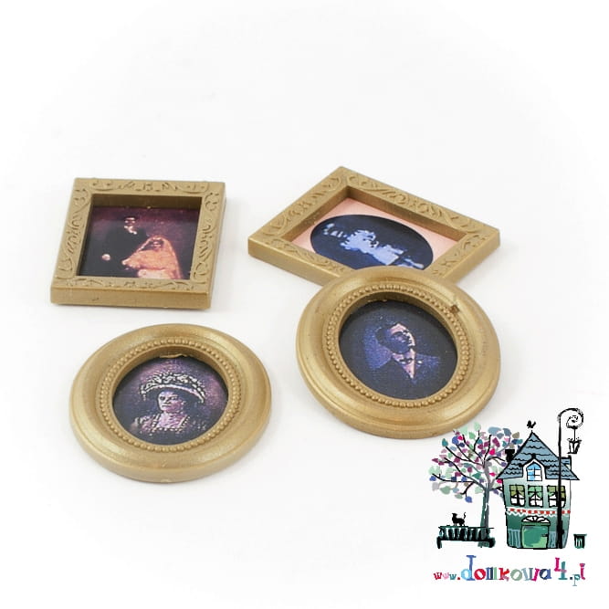 Komplet czterech fotograficznych portretów. Dwie złote ramy prostokątne i dwie owalne. Ramy w kolorze starego złota. Zestaw może znaleźć swoje miejsce na ścianie w salonie, w sypialni czy np. przy fortepianie.