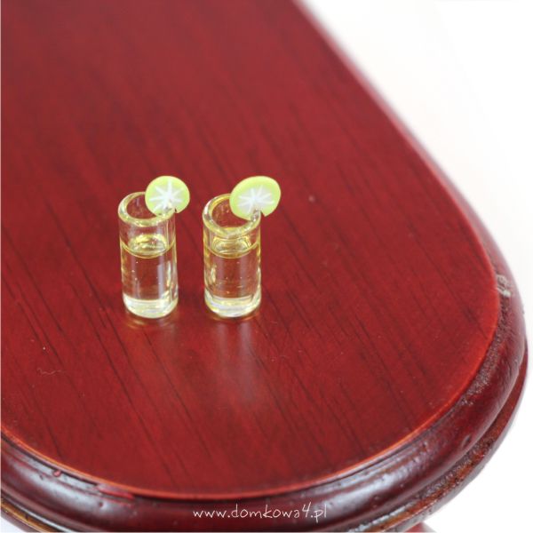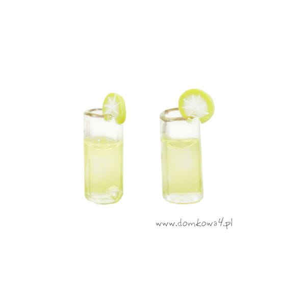 Szklana miniatura dwóch szklanek z lemoniadą i plasterkami cytryny.