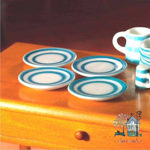 Porcelanowy komplet czterech płaskich, miniaturowych talerzy w kolorze białym z jasno-błękitnymi pasami.