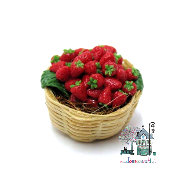 Miniaturowy, koszyk pleciony pełen świeżych truskawek.
