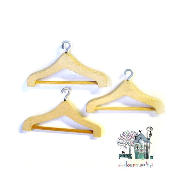 Komplet czterech miniaturowych drewnianych wieszaków ubraniowych na ubrania.