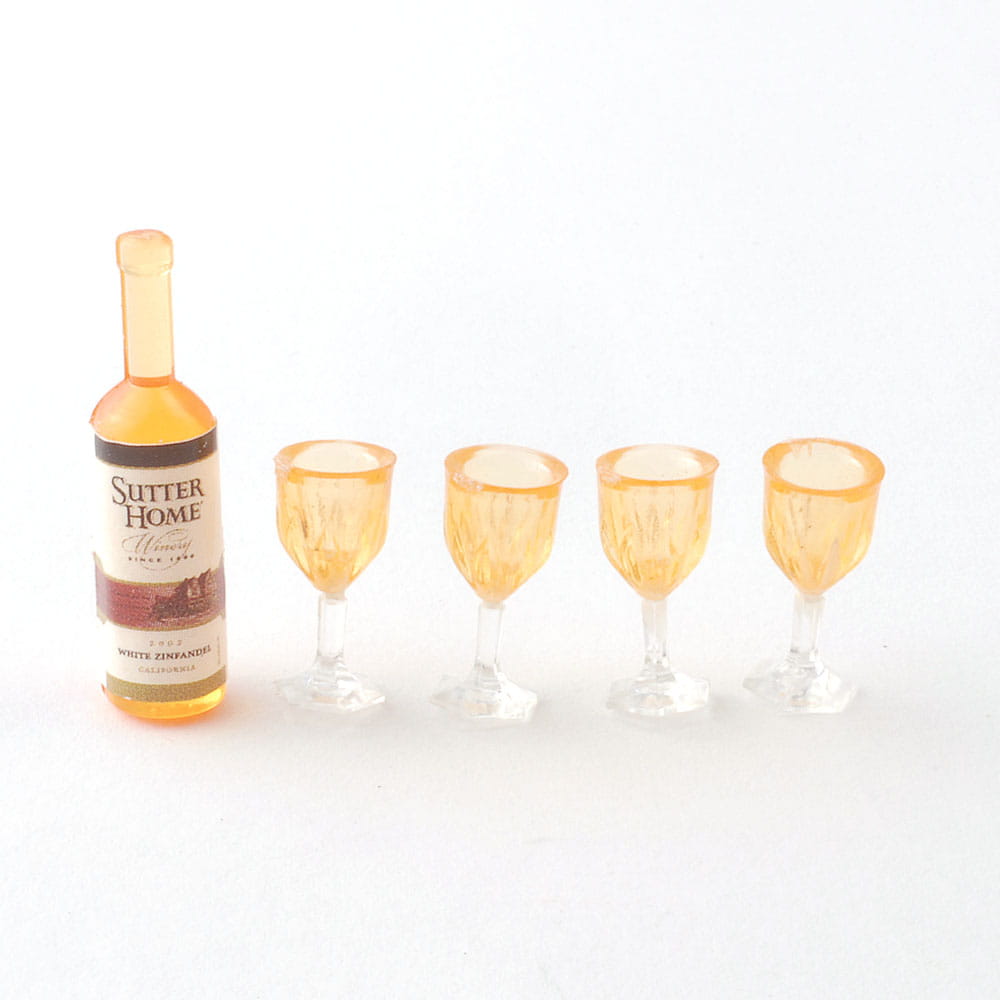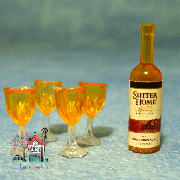 Miniaturowy komplet- butelka wina i cztery lampki.